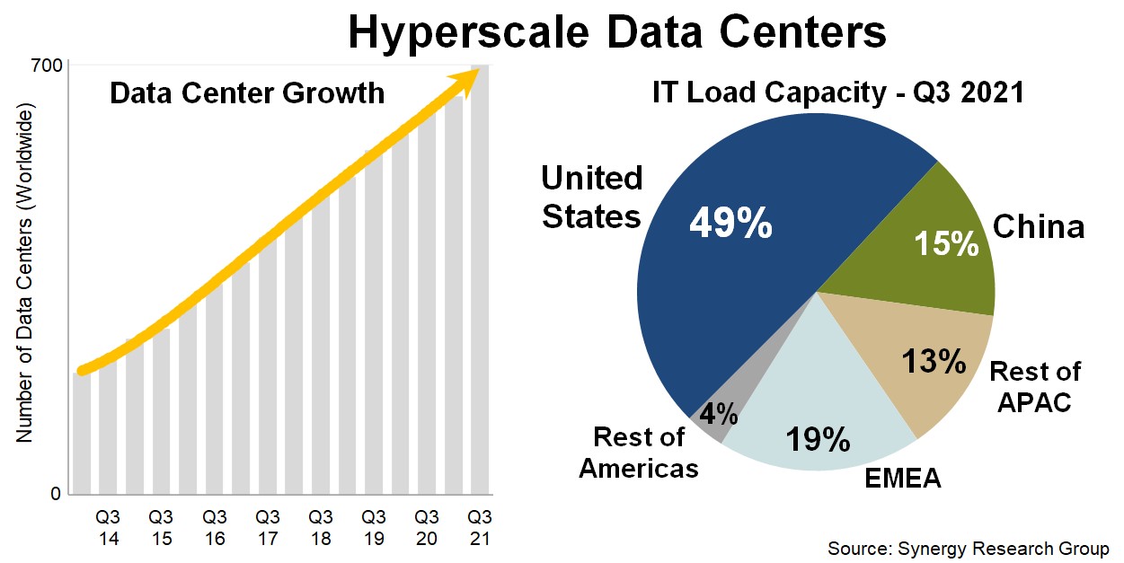 根据 Synergy Research 的跟踪,全球大型云公司所有拥有的数据中心在四年时间翻了一倍,达到了 700 个左右。