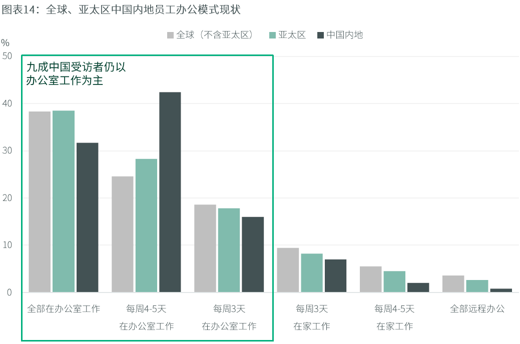 世邦魏理仕在 2022 年 11 月调研数据显示,现状 90% 以办公室为主,意愿角度有 82% 愿意以办公室为主。这个意愿比例比亚太和全球平均值显著搞出 12 和 18 个百分点。