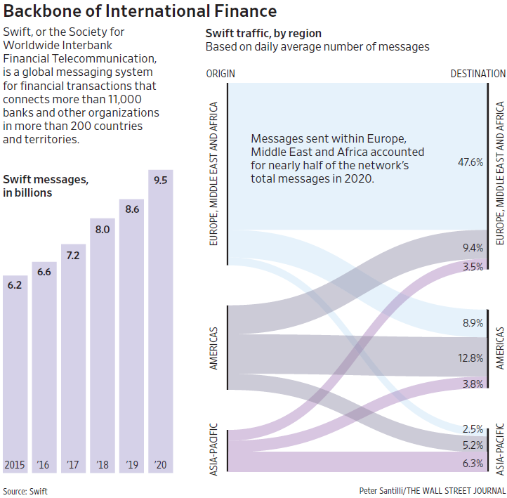 附图来自 WSJ,展示了 SWIFT 近年的信息量和不同区域的往来流量分布。