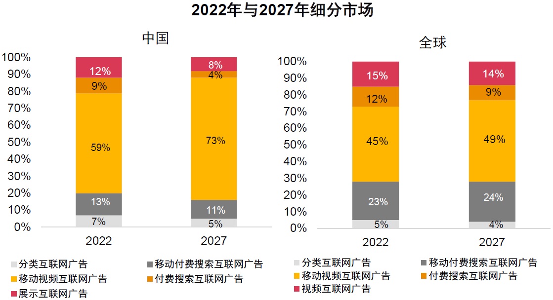 PwC 研究了 2022-2027 年全球和中国互联网广告的细分构成,可以看到中国在 “移动视频互联网广告” 的占比是非常突出的,显著高于全球的比例。