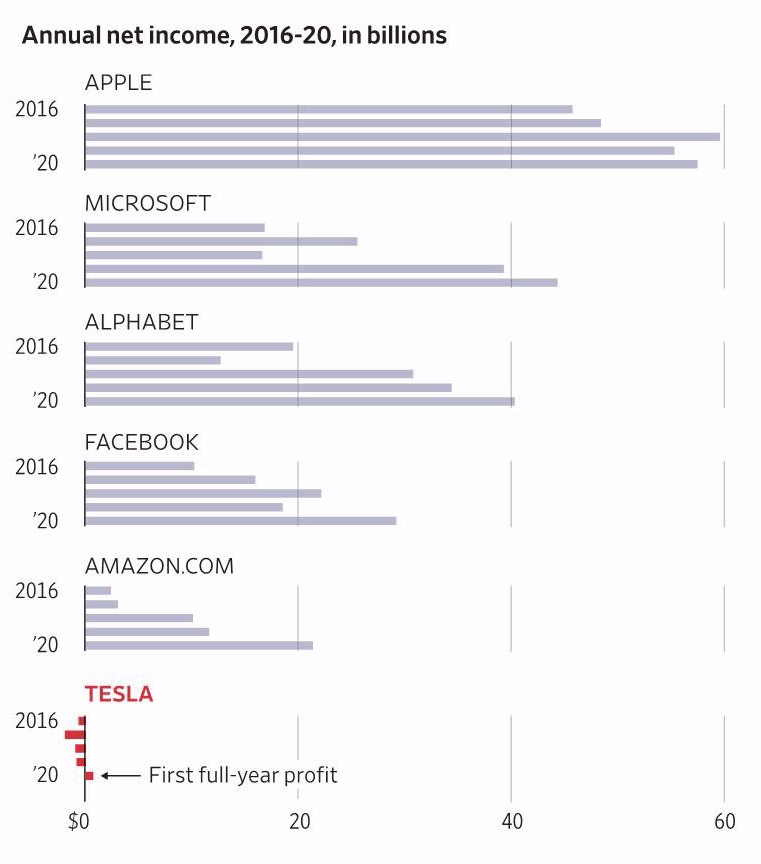 今年以来特斯拉股票涨到四倍,华尔街日报用一张面积图可视化呈现了特斯拉与 S&P 500 市值最大的一些股票的对比。