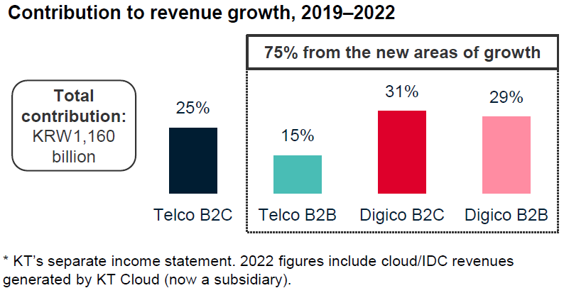 韩国电信运营商 KT 将其业务分为四大板块,分别是 Telco B2C(通信类消费者业务)、Telco B2B(通信类政企客户)、Digico B2C(数字娱乐、内容、消费者 IoT 等)、Digico B2B(企业数字化、数据中心、AI 和区块链等)。