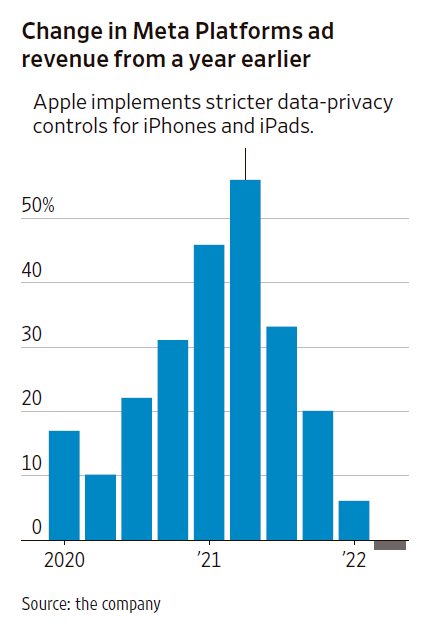 下图来自 WSJ,可以清晰地看到 Apple 隐私新政以后,META(Facebook)收入增幅的剧变。