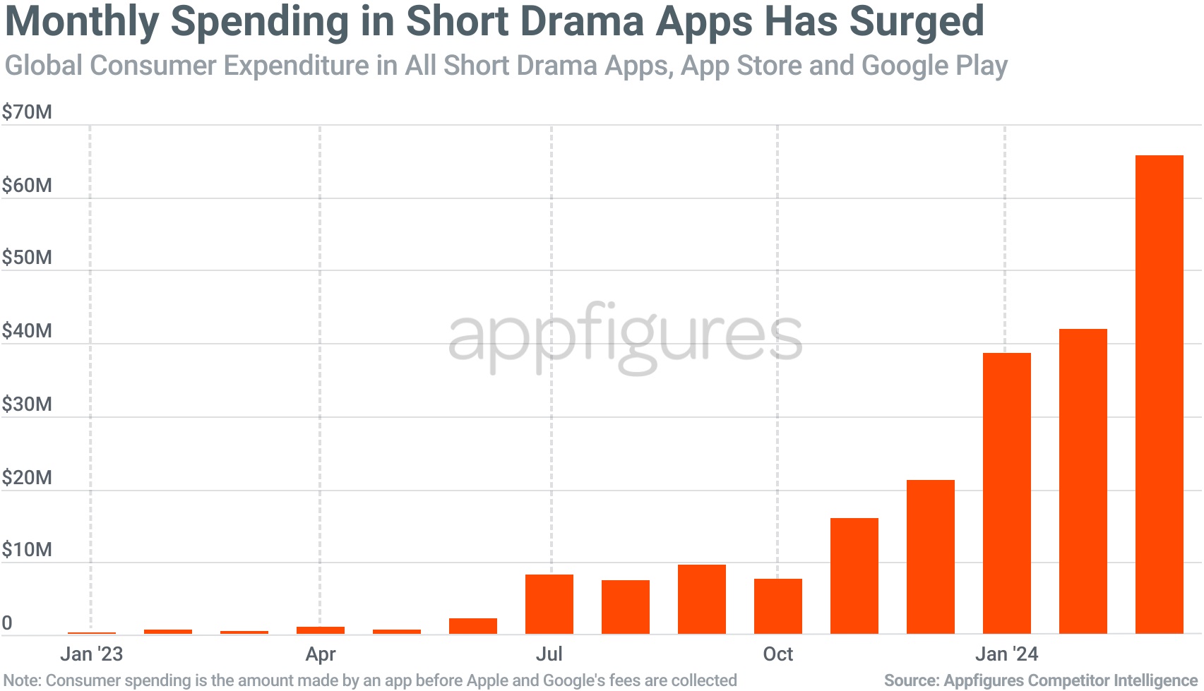 实际情况显然有不同。Appfigures 数据监测显示,2024Q1, ReelShort 和 DramaBox 等 66 款短剧应用在全球消费者支出中创造了创纪录的 1.46 亿美元收入。这比 2023 年第一季度的 180 万美元增长了 8,000% 以上。