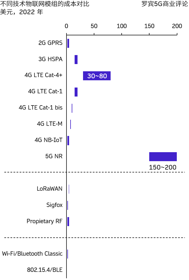 Berg Insight 咨询公司对比了 2022 年主要物联网技术模组的成本区间。