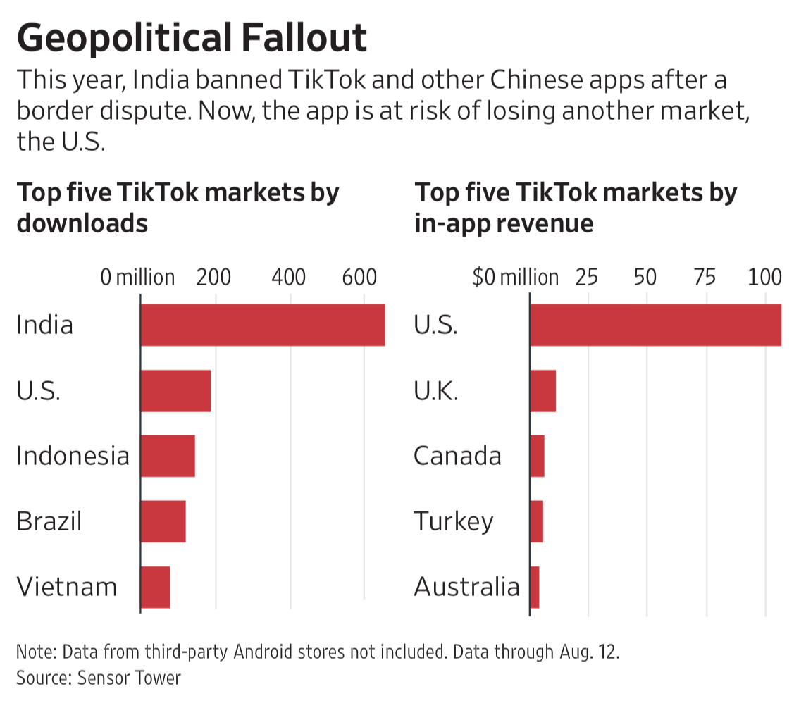 根据 Sensor Tower 的估算,抖音海外版 TikTok 在海外的前五大市场分别为: