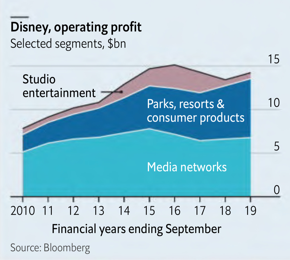 附图是迪士尼近年运营利润各业务单元的贡献。