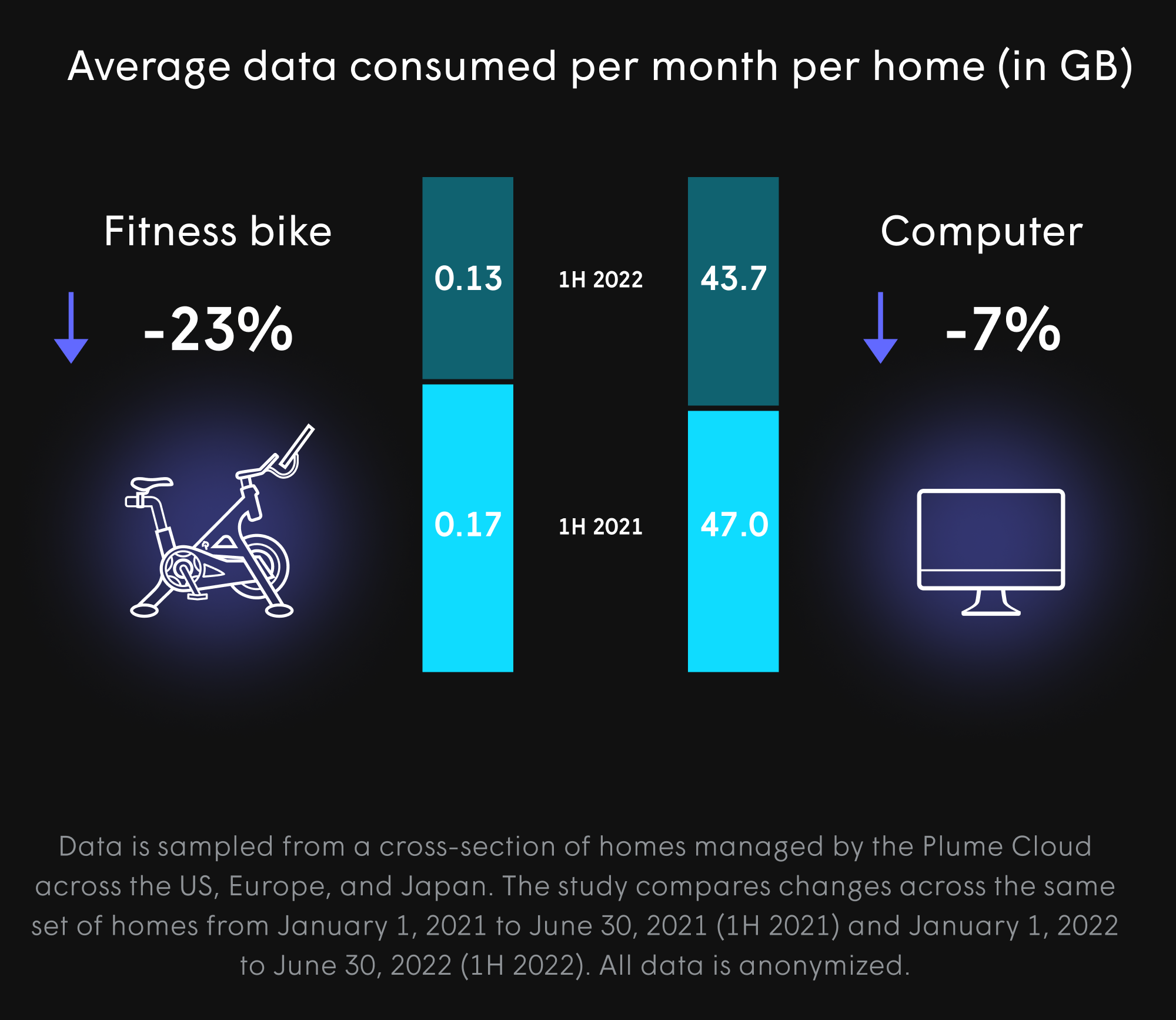 Plume 是一家为美国、欧洲和日本提供智能家居技术和平台服务的公司。附图是其监测的数据,家庭各类智能设备的增长变化(2022 年对比前一年)。