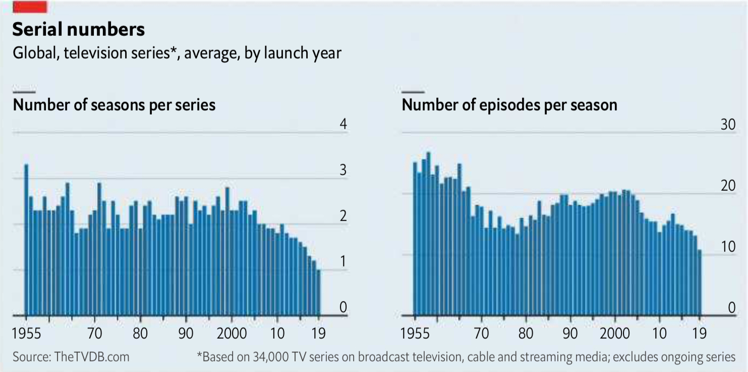 基于 1955 ~ 2019 年 34,000 电视剧的统计发现,电视剧每个系列的平均季数(Season)持续下滑到 1(即没有续集),而每季的剧集长度也从高点的 20 集下降到 11 集。