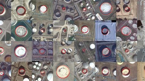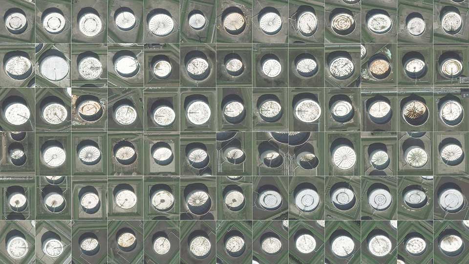 其当时举的几个例子中,原油存储就是一个典型 Use Case。以 图 2 和图 3 为例,浮顶式储油罐的灌顶在满载和空置状态高低是不同的,进而光影的深度也是不同。通过卫星照片,把全球主要原油存储的油罐的空置情况进行分析,可以作为一个维度用来估算各国原油的储备情况。