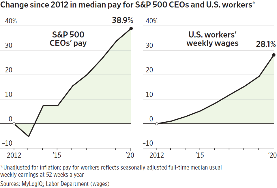 WSJ 绘制了一张图,对比了标普 500 强(S&P 500)CEO 和美国职员的中位数薪酬变化。