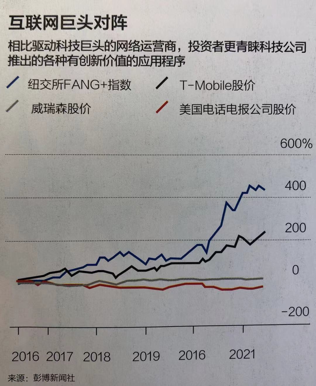 2016~2021年,FANG+ 指数上涨了 400% 以上,T-Mobile 上涨了 200% 以上;而 AT&T 和 Verizon 则是负增长。