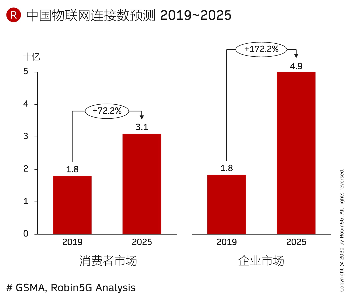 GSMA Intelligence 估计中国大陆 2019 年物联网连接总量为 36.3 亿,预测 2025 年将达到 80.1 亿。