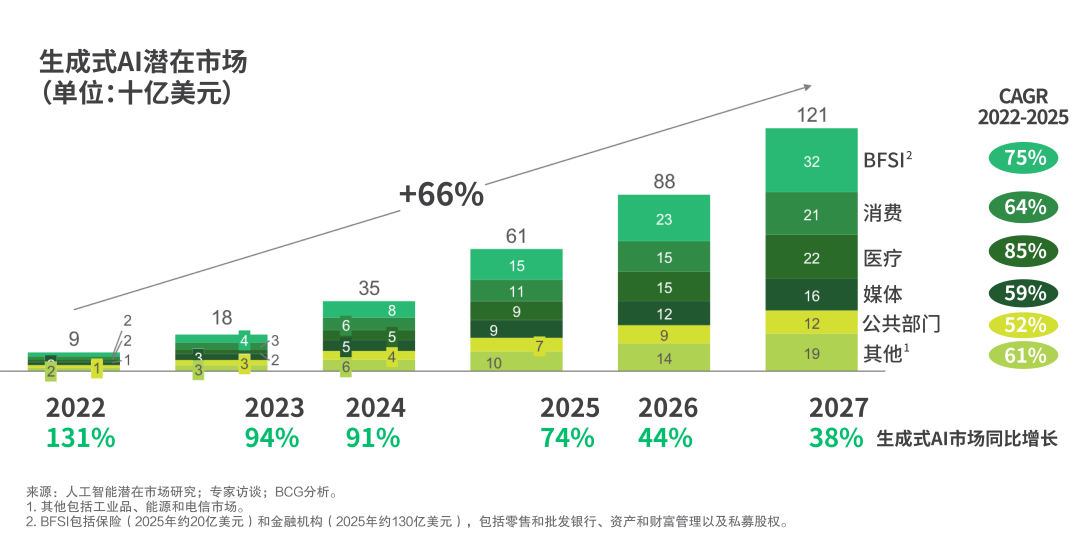 BCG 预计到 2027 年,生成式 AI 的潜在市场规模可达到 1,200 亿美元。