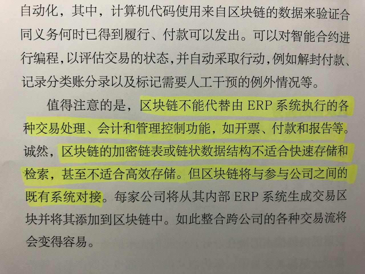 ⑴ 区块链主要用于供应链交易环节的所有参与方同步,每方都持有一个加密账本;这并不能代替ERP和财务系统的日常功能;(基本功能不可代替,就意味着任何现有系统都会保留)
