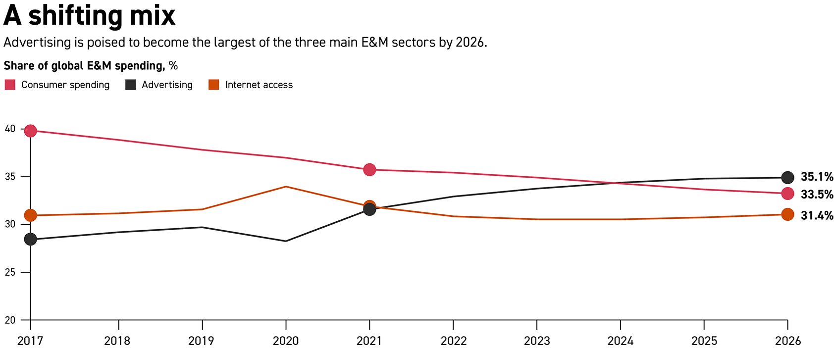 预计到 2026 年,广告占比会提升到 35.1%,成为收入第一大类别。而消费者开支部分则下滑到 33.5% 位居第二位。