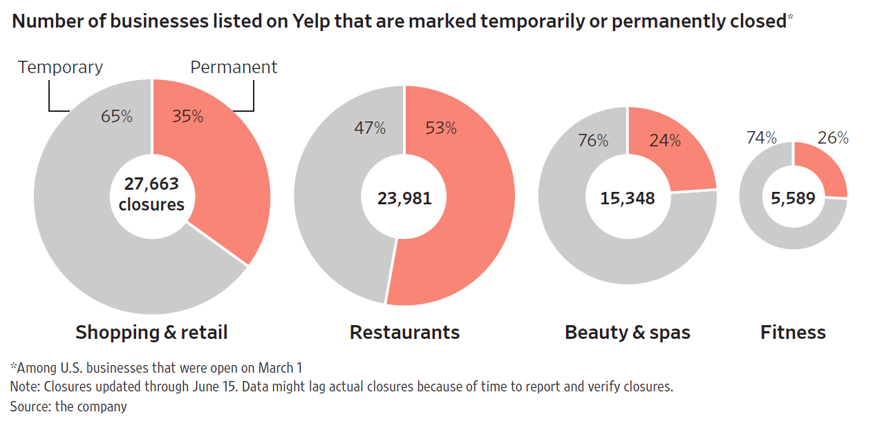 Yelp 是美国最大的商户点评网站,其公布了2020年3月1日到6月15日期间 “临时关闭” 和 “永久关闭” 的商户数字。