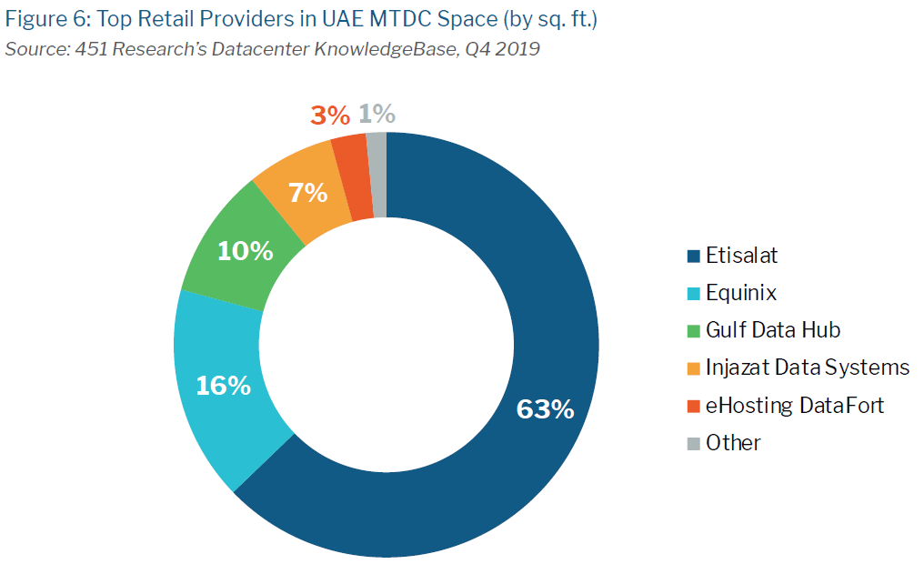 附图是阿联酋 UAE 数据中心零售服务商的市场份额(按可销售机柜面积),第一名是本地的电信运营商 Etisalat,占据了 63% 份额处于绝对的主导地位;其次是 Equinix、Gulf Data Hub 等专业第三方主机托管公司。