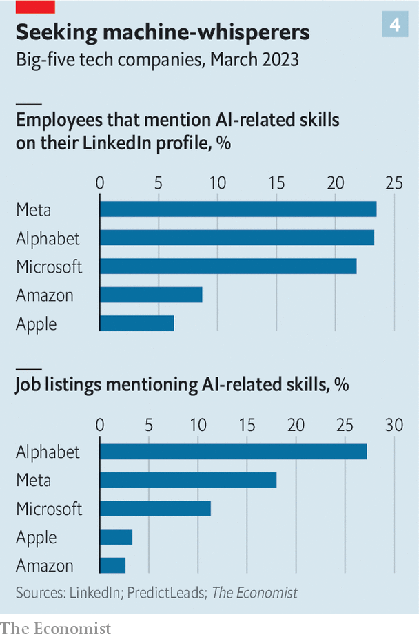 The Economist 基于Linkedin 和 PredictLeads 网站的数据进行了分析,Meta、Alphabet(Google) 和 Microsoft 大约 20~25% 的员工在个人技能描述上强调和 AI 相关;从岗位招聘的角度,也是这三家公司 AI 岗位占比最高,其中 Alphabet 的岗位招聘中四分之一以上是 AI 相关。
