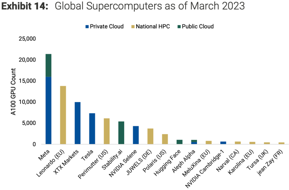 Morgan Stanley 对比了全球主要机构(政府组织和企业)在 NVIDIA A100 GPU 持有数量。
