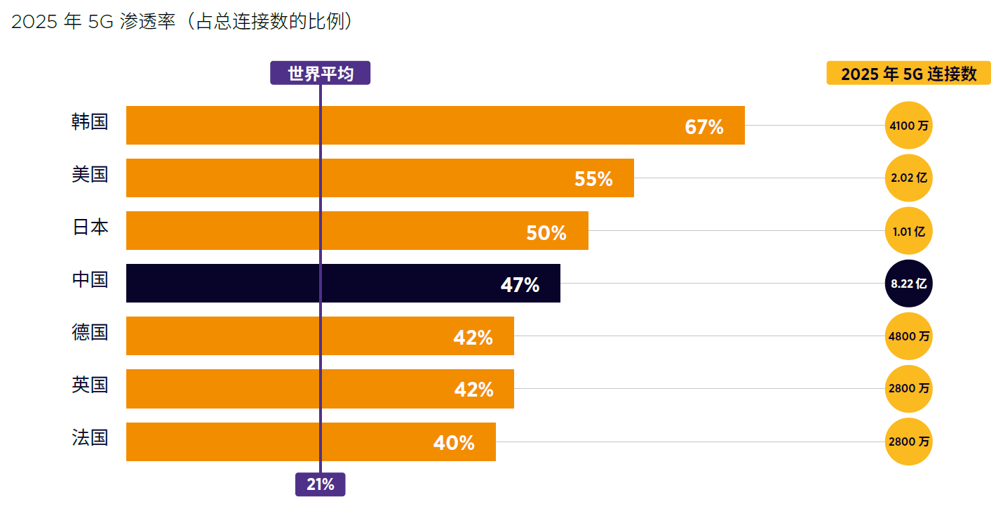 GSMA 预测到 2025 年,世界平均的 5G 用户渗透率为 21%,而韩国、美国、日本会超过 50%。