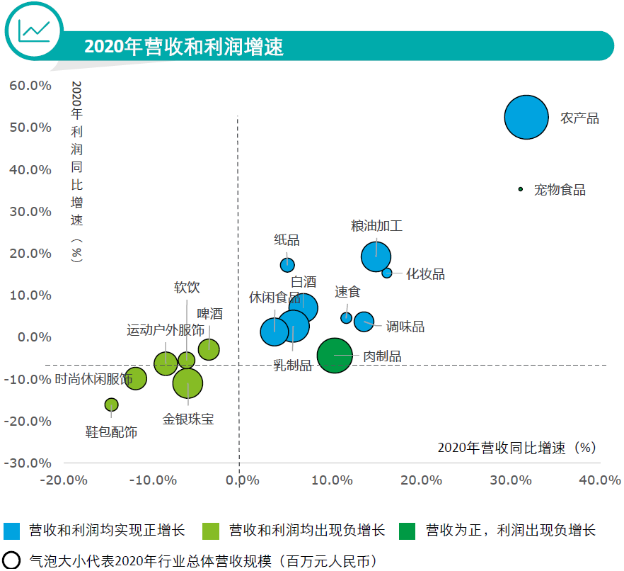 德勤咨询绘制了一张图,针对中国消费品和零售行业细分赛道的 2020 财务表现。横轴是营业收入的同比增幅,纵轴是利润的同比增幅。