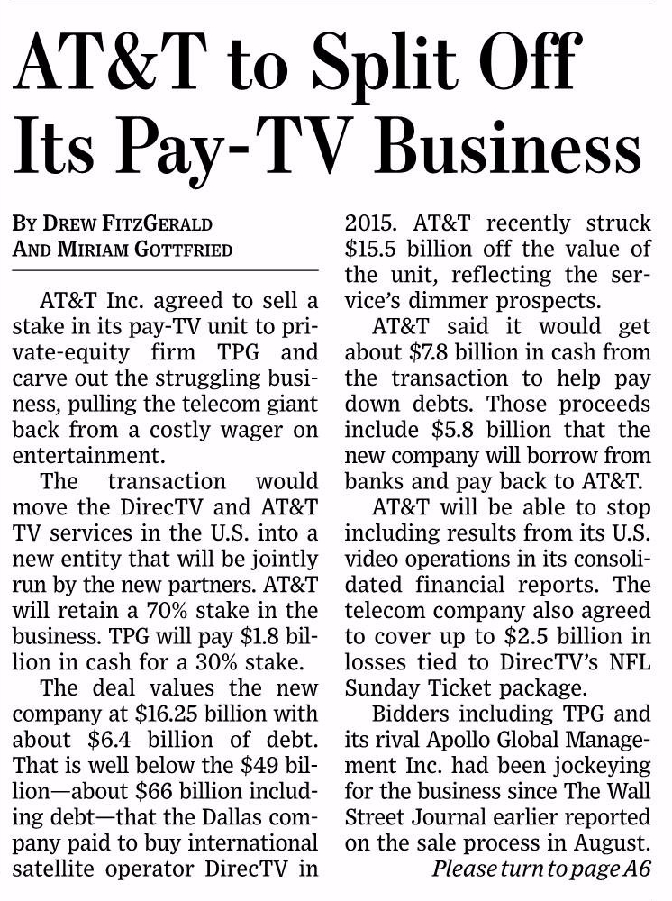 根据 WSJ 的消息,AT&T 同意将旗下付费的电视业务(DirecTV 和 AT&T TV Services)分拆为一个独立的实体,并持股 70%。TPG 花费 18 亿美金,获得另外 30% 的股份。