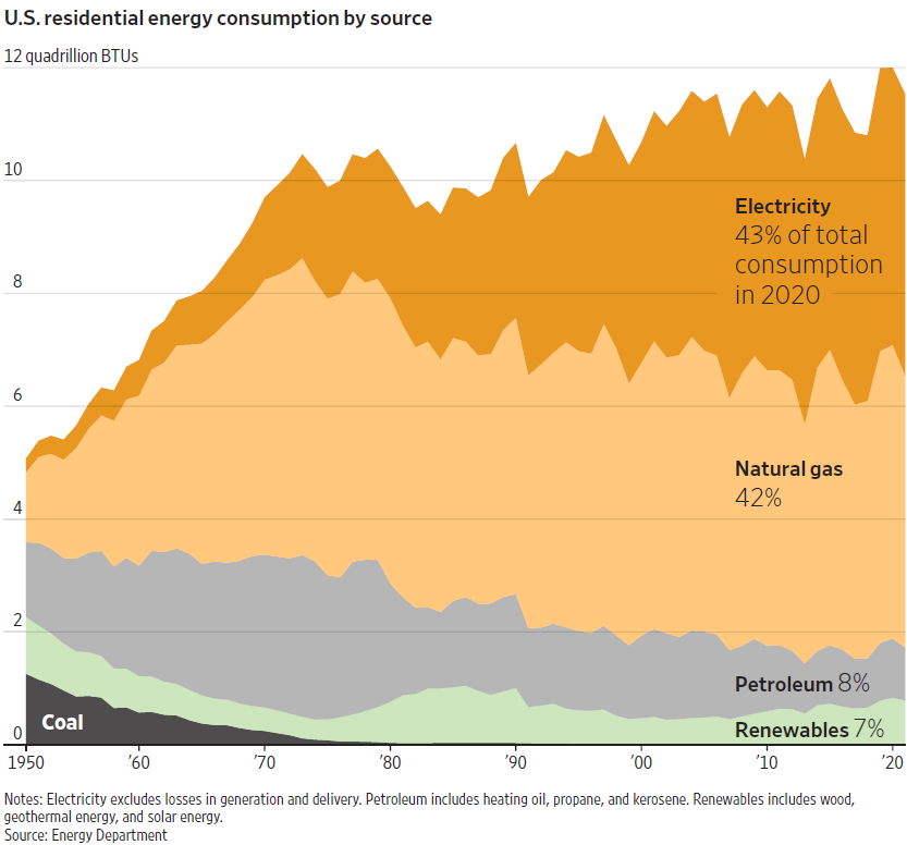 读到一张很有趣的图表,WSJ 以美国市场为例,展示了 1950 年以来,煤炭在美国的应用场景。