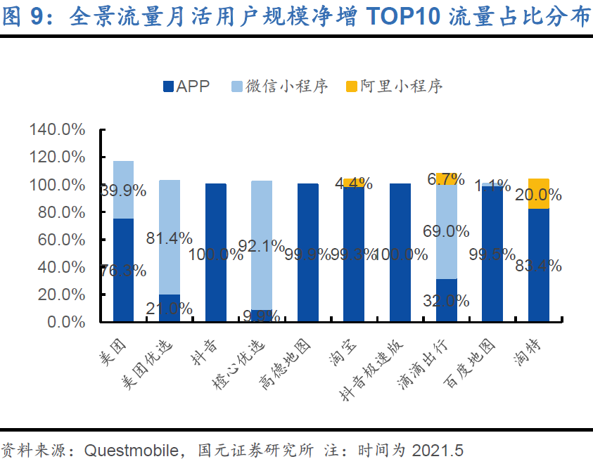 附图来自 QuestMobile,其列举了十个热门应用的访问情况。很清楚可以看出来,黄色的 APP 和灰色的微信小程序占据了最大比例。