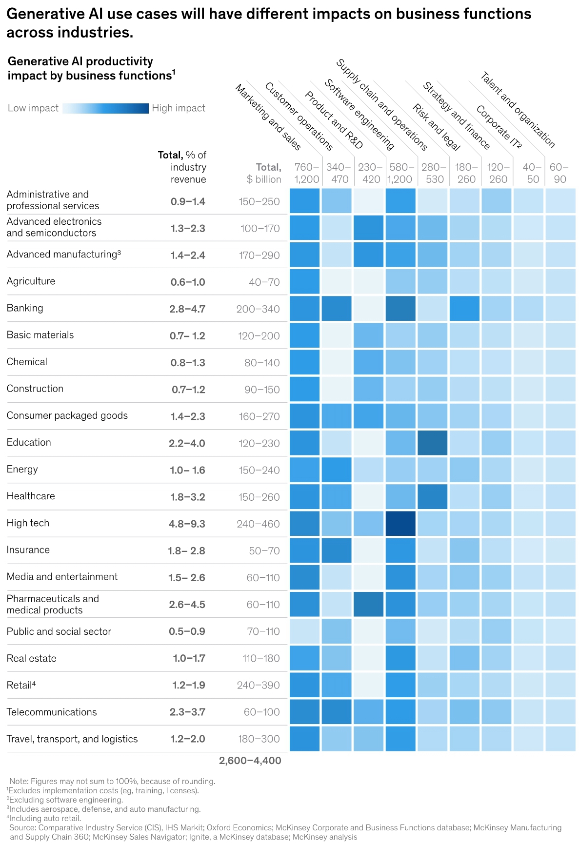 Mckinsey 认为生成式 AI(AGI)会对几乎所有垂直行业造成经济影响。而对于某个行业内部,不同的职能方向面临 AGI 影响程度也有不同。