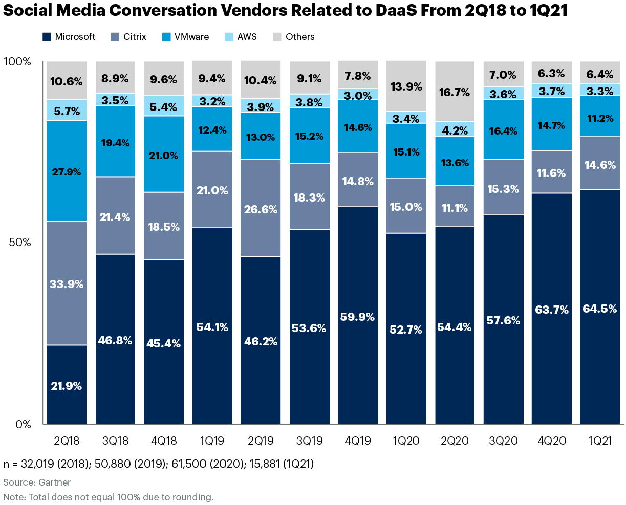 Gartner 针对社交媒体上围绕云桌面的讨论声量做了统计,Microsoft, Citrix, VMare, AWS 位居 Top 4 品牌。