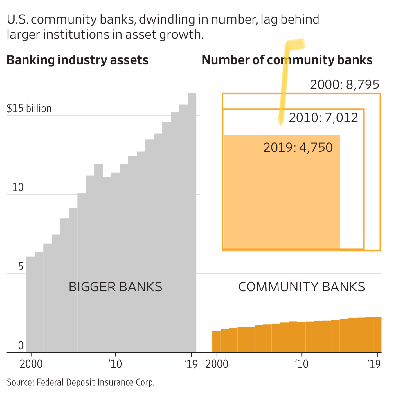 美国的社区银行从 2000 年的 8,795 家下降到 2019 年的 4,750 家。侧面也反映了中小型企业的经营状态。
