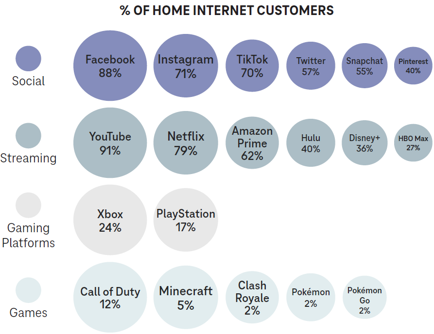 用户上网要么通过移动网络(4G、5G),要么固定宽带(包含家里的 Wi-Fi)。两者通常比例悬殊很大,以美国为例,一般移动用户每月 10GB 左右,而家庭固定宽带通常每月在 400GB 以上。