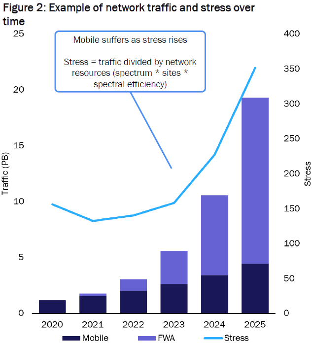 Analysys Mason 的一项研究显示(下图),如果某个网络的负载在 2021-2023 状态,5G 移动网络容量存在空闲,此刻用来发展 5G FWA 是很合算的,因为复用了移动业务的 CAPEX 和 Opex,可认为是零成本。