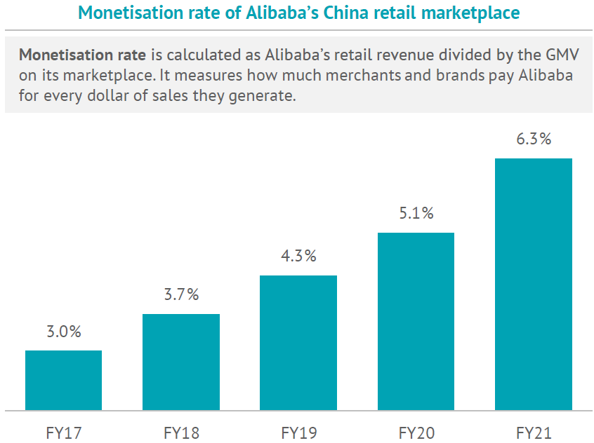 附图是 SCMP 的研究,阿里巴巴的货币化率从 2017 年的 3% 持续提升到 2021 年的 6.3%(预计),四年时间翻了一倍。