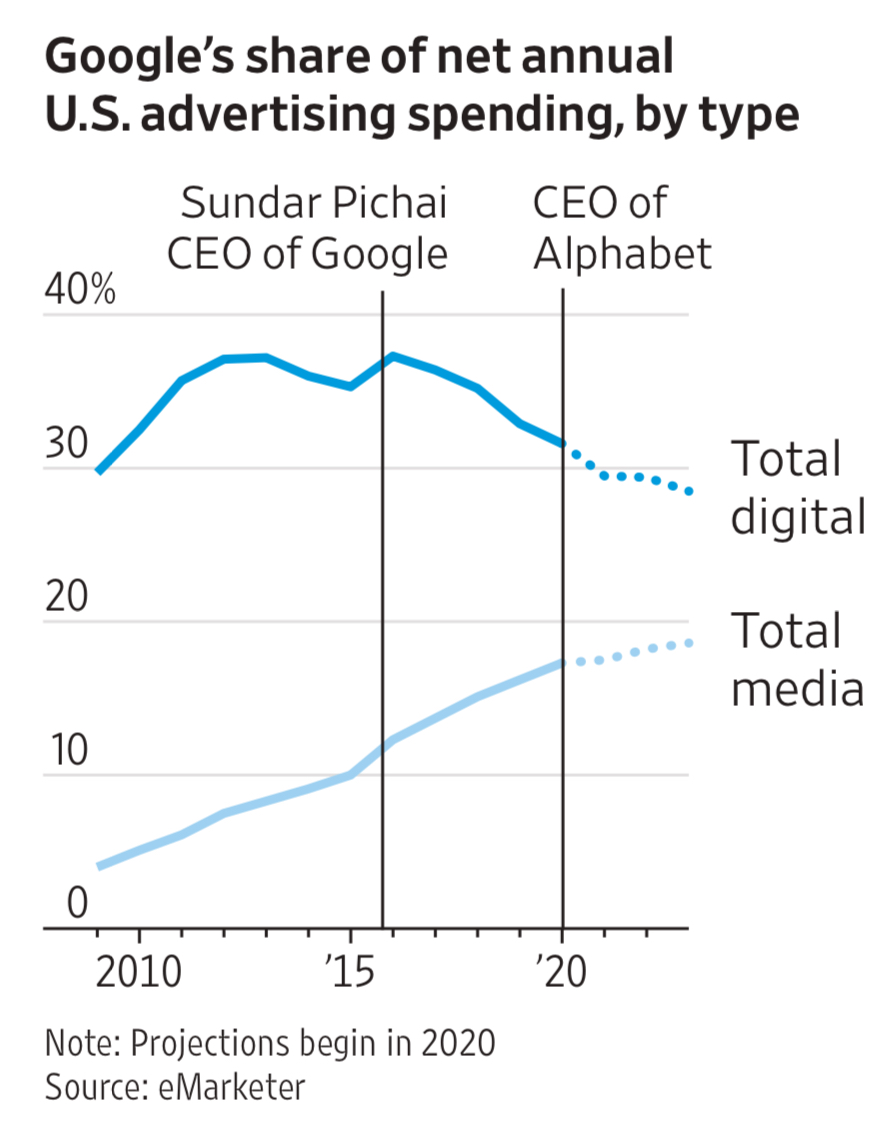 华尔街日报绘制了一张图,展示了谷歌在美国广告行业的市场份额。