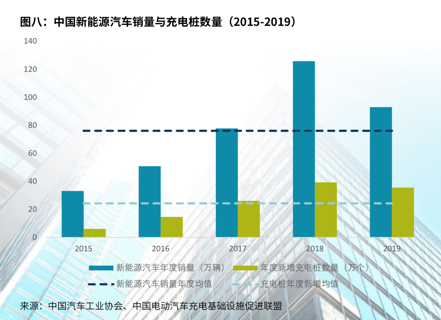 2015~2019年,中国新能源汽车的平均年销售量为76 万辆;而充电桩的年新增量仅为 24 万个。