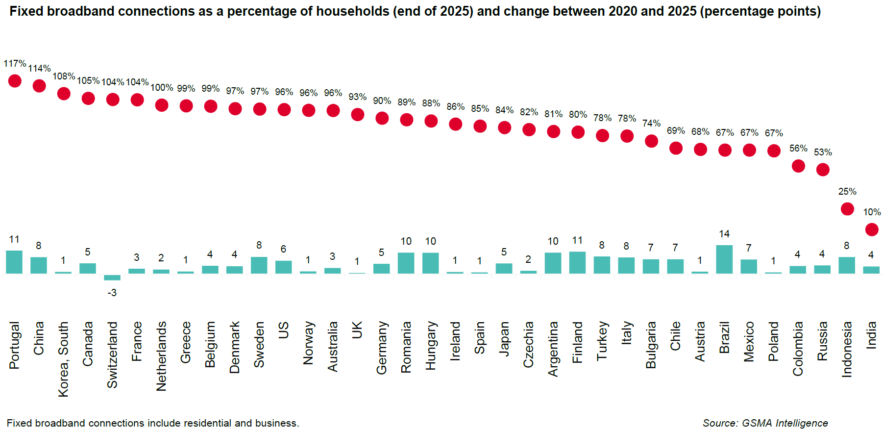 Credit Suisse 比较了代表性国家固定宽带的渗透率对比。