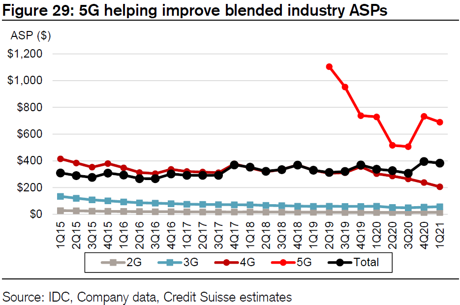可以看到,5G 的价格普遍高于 4G ,体现了新一代产品对产业价值向上提升的作用。