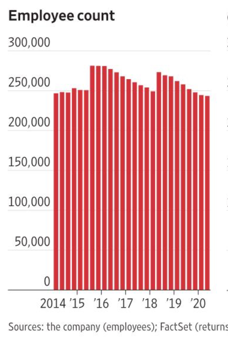 2014 年 AT&T 全公司有接近 25 万雇员。2015 年和 2018 年 AT&T 大幅举债收购 DirecTV(卫星电视服务商)和 Time Warner (时代华纳)进军媒体内容行业后,员工数量两度达到 27~28 万之多。