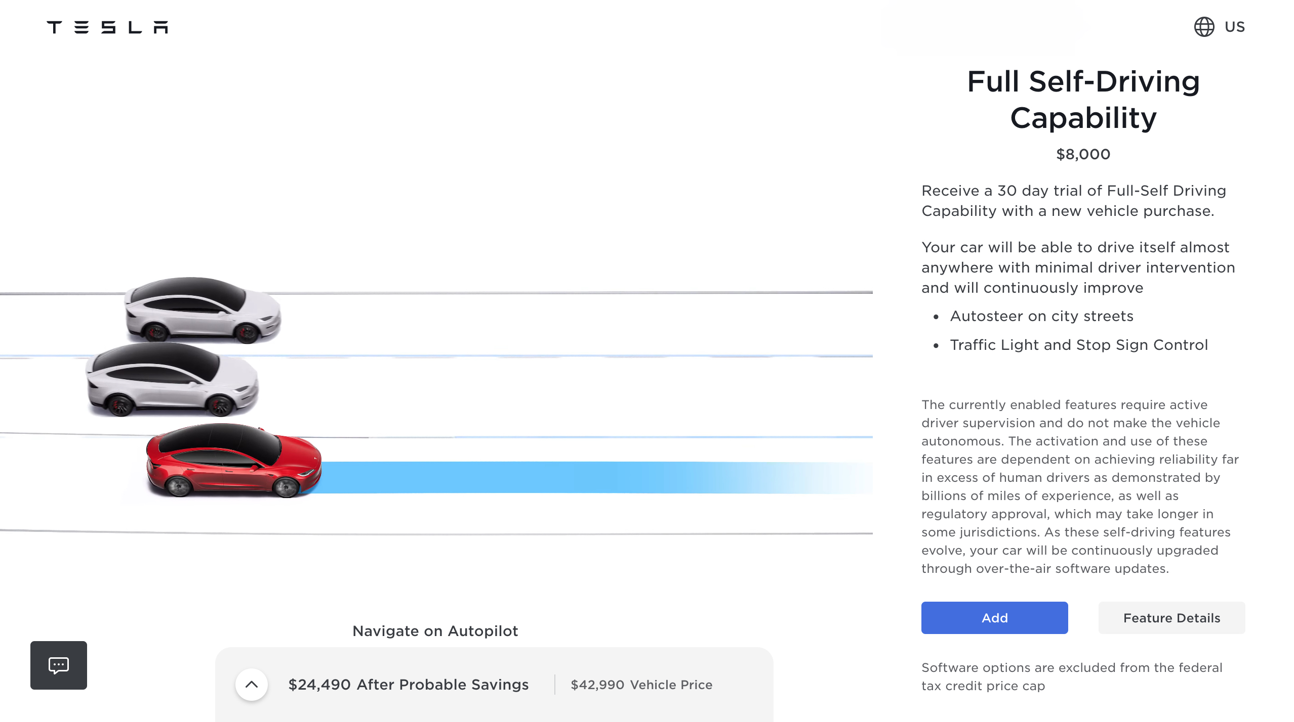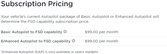 目前特斯拉 FSD 的定价模式,可以买断软件版本升级( 8000 美元 @ 美国市场),也可以采用 99 美元的月费订阅模式。