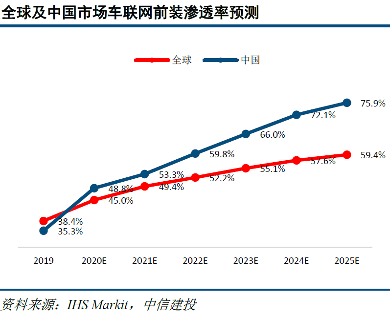 根据 IHS Markit 的研究,到 2025 年全球前装车联网渗透率为 59.4%,中国则会更加领先,达到 75.9%。