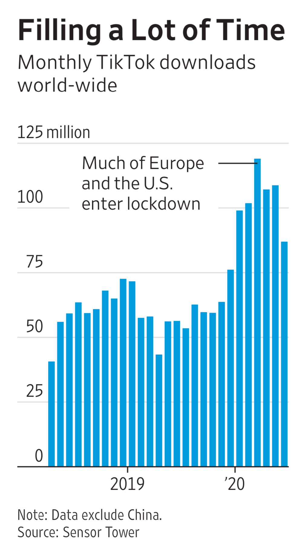 抖音国际版 Tik Tok 已成为国际市场最流行的应用,新冠疫情后下载量进一步激增。最近几月均保持一亿以上的月度下载量。