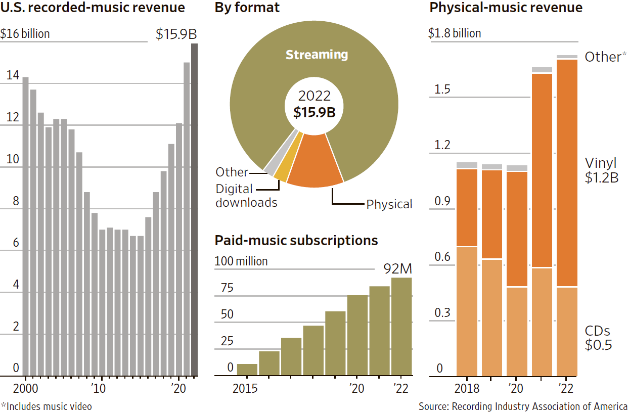 WSJ 数据显示,2022 年美国整体的音乐行业收入达到并超过了 2000 年的峰值,达到了 159 亿美元。