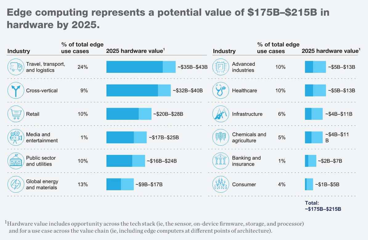 Mckinsey 的一项研究,针对各垂直行业边缘计算的硬件类开支的潜在市场空间:1750 ~ 2150 亿美元 @ 2025年。