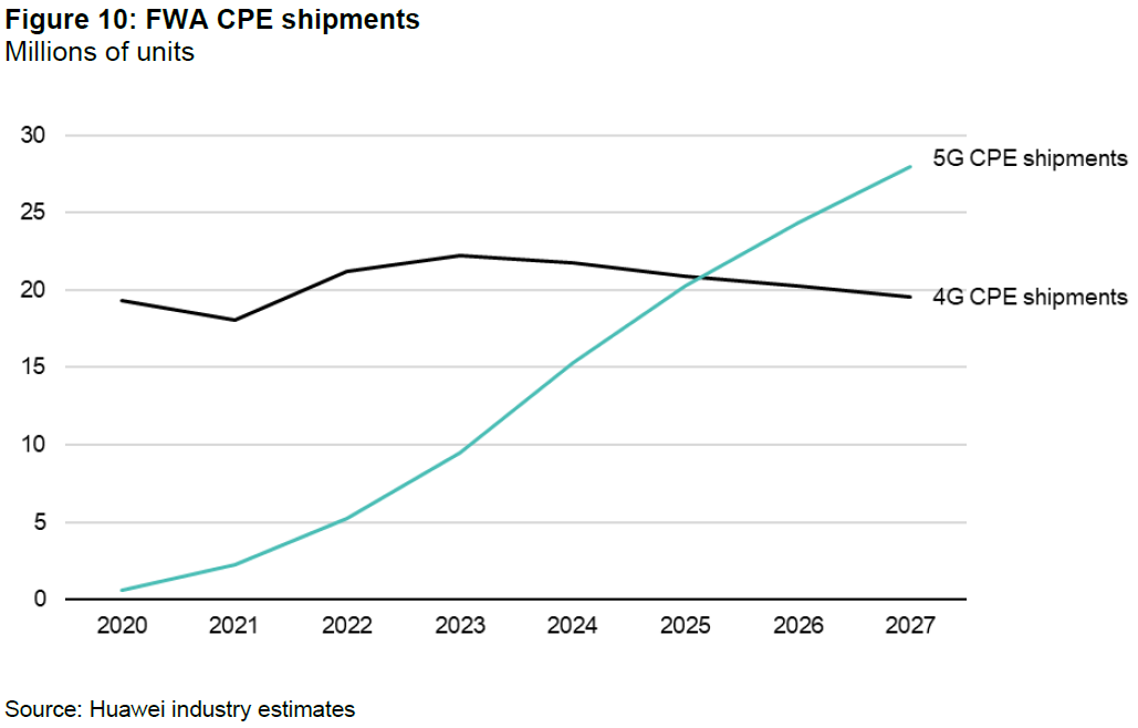 GSMA 引用华为的研究,预计未来几年全球 4G CPE 的出货量会稳定在 2,000 万套左右,而 5G CPE 的出货量则在加速上行,预计 2025 年后会超过 4G CPE 的出货量,并会保持增速。