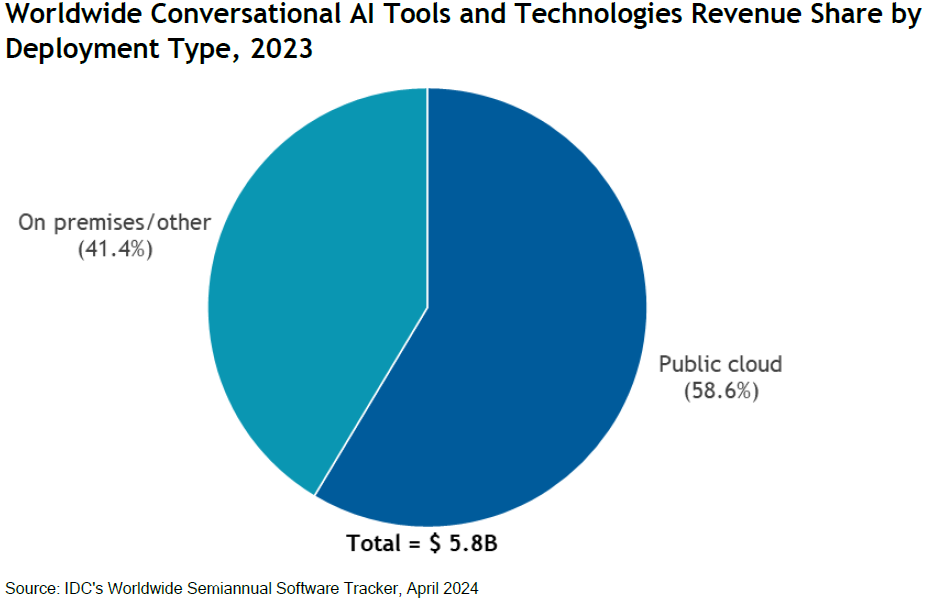 IDC 咨询公司研究显示,2023 年全球会话式 AI IT 工具收入体量为 53 亿美元。Microsoft、Google 和 Qualtrics 是排名前三的厂商。