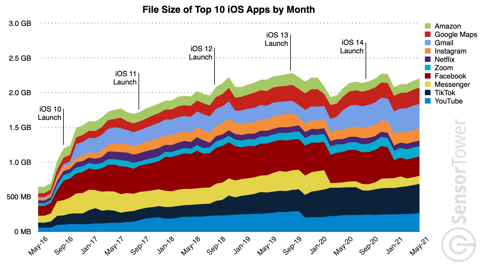 根据 Sensor Tower 的数据,美国 5 月份下载量排名前 10 的 iPhone 应用程序大小基本是五年前的四倍,需要 2.2 GB 的存储空间(仅应用程序,不包括安装后新产生的内容下载)。