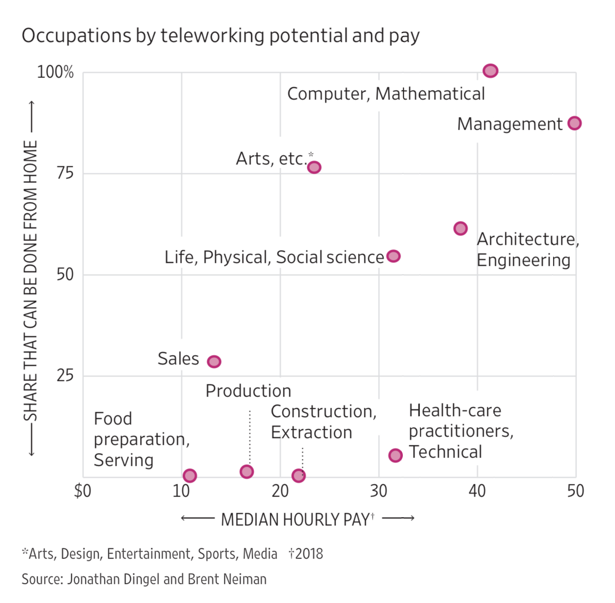 华尔街日报的一组数据:横轴是每小时薪水,纵轴是可在家远程办公的比例。