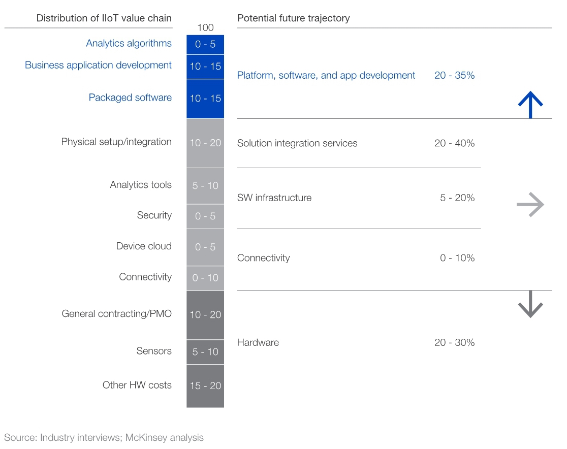 Mckinsey 最新分享了一项调研,针对工业互联网协议栈各部分工作的产业链条的空间占比现状及未来走势。